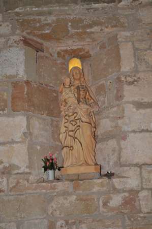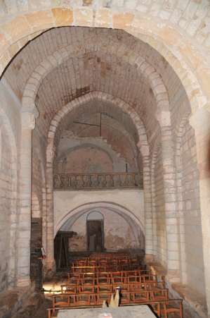 À l’intérieur, la tribune avec ses nervures et la voûte avec son arc doubleau en ogive annoncent les caractéristiques du XIII°siècle. L’église n’est éclairée que par 3 trois petites ouvertures situées à droite et à gauche du chœur dont une murée.